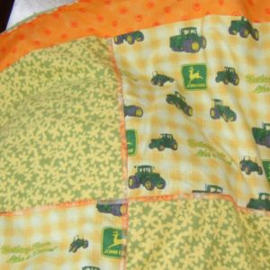 If you noticed I made this John Deer a bit more girlie...because the girl I made it for loves JD and I just couldn't bring myself to make it look boyish....She loved it I loved it...Too fun...and yes try that flat lock stitch it is the best for blankets!! As you noticed I also used the fun thread with lots of varied colors to it!! The JD fabric is in the cotton..the flower square is the flannel and the back of course is the fleece..The surround it cotton as wellGlad you enjoyed..